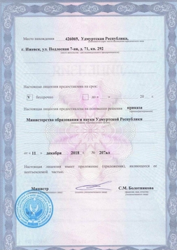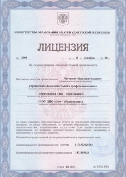 Наш образовательный центр действует согласно лицензии Министерства Образования № 18-85-00134 № Л035-01265-18/00256741 от 25 ноября 2021 года № 2000 (серия 18Л01 номер 001995) от 11 декабря 2018 года